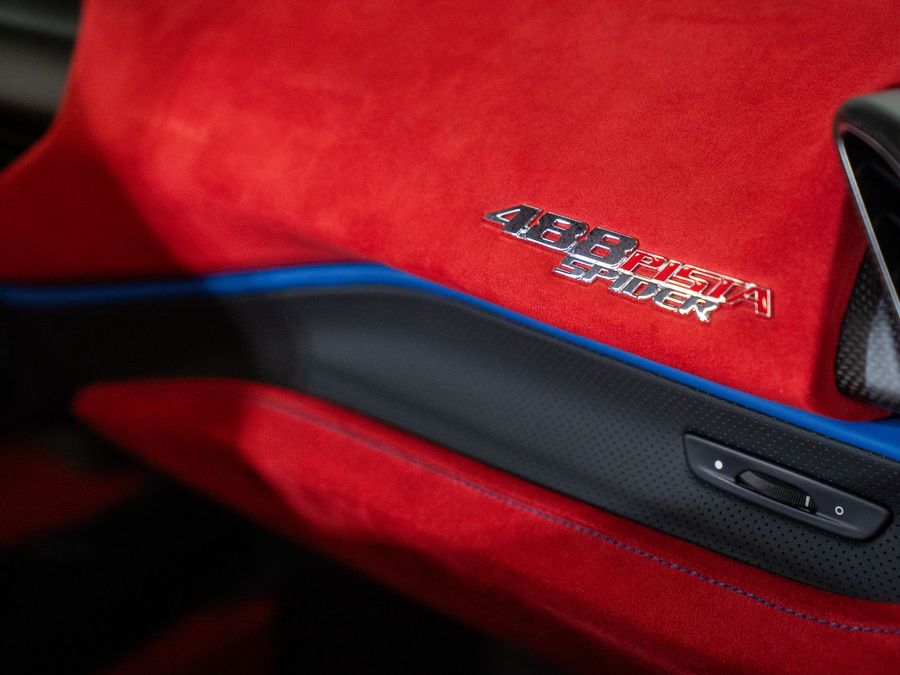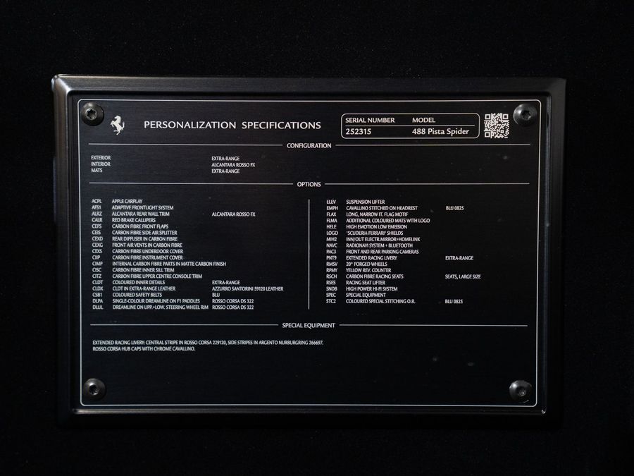 Chassis #ZFF91HMA6L0252315 remains in outstanding condition, accompanied by its personalization plaque, window sticker, matching accessories, and manuals. With its bespoke paintwork, extensive carbon fiber specification, and Extra Campionario status, this Pista Spider stands out as one of the most unique Ferrari V8 Spiders of the modern era.